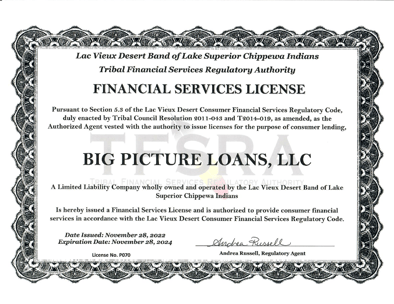 *** Big Picture Loans is a wholly owned subsidiary of Tribal Economic Development Holdings, LLC, a wholly owned and operated economic arm and instrumentality of the Lac Vieux Desert Band of Lake Superior Chippewa Indians (“Tribe”), a federally recognized Indian tribe, created for the benefit of the Tribe and operating pursuant to Tribal law. Big Picture Loans is a duly licensed Financial Services Licensee of the Lac Vieux Desert Tribal Financial Services Regulatory Authority, an independent regulatory body of the Tribe, and operates in accordance with the Lac Vieux Desert Band of Lake Superior Chippewa Indians Tribal Consumer Financial Services Regulatory Code, which can be found here: Tribal Consumer Financial Services Regulatory Code.pdf.